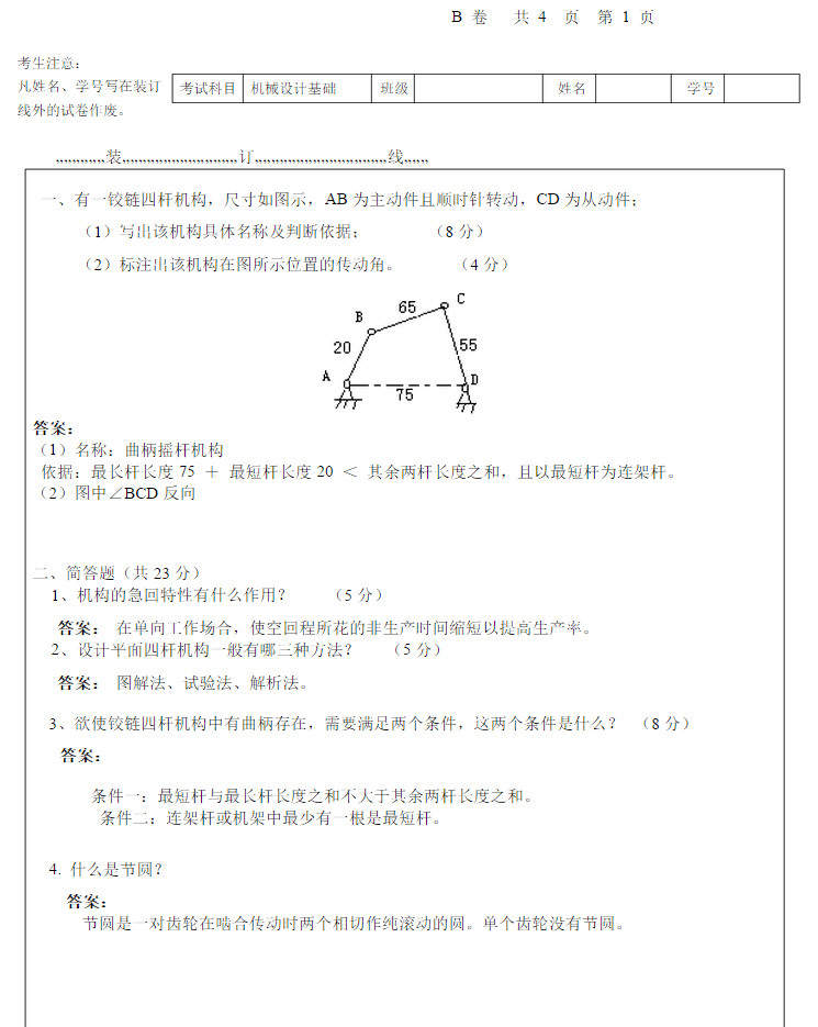 一、分析简答题(24分,每题4分) 1、 试分析并简述车床加工阶梯轴时,刀架进给凸轮的工作过程对凸轮机构从动件运动规律有何要求,并画出机构工作原理图。 2、 试分析并简述根据给定两连架杆的位置设计四杆机构的过程。 3、 试根据机构组成特点,举出两种能扩大从动件工作行程的机构,并画出机构草图。 4、 试根 ...