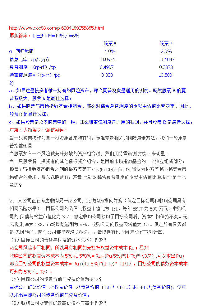 1、 根据CAPM模型,假定市场组合收益率为15%,无风险利率为6%,某证券的Beta系数为1.2,期望收益证券( )