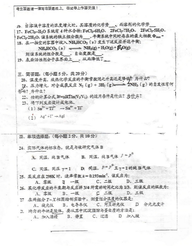 华中师范大学物理化学2009考研真题(2)
