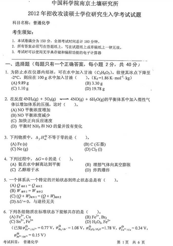 中国科学院南京土壤研究所2012普通化学考研真题