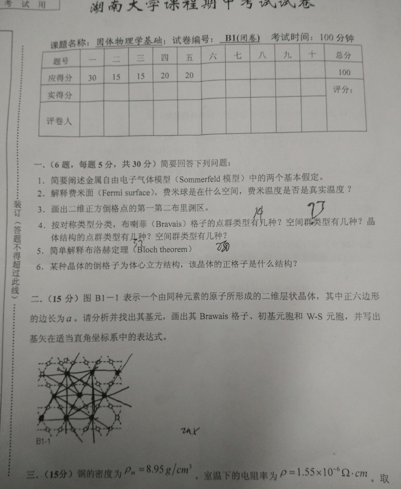 湖南大学2015固体物理基础期中考试试卷