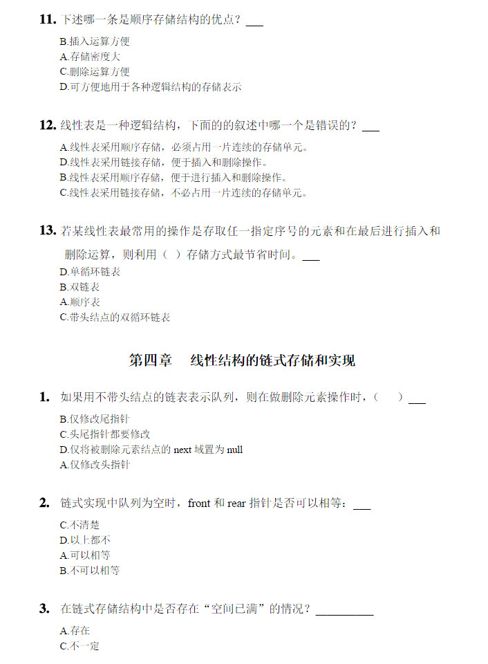 一、选择题(每题2分,共20分) 1.单链表的一个存储结点包含( D )。 A.数据域或指针域 B.指针域或链域 C.指针域和链域 D.数据域和指针域 2. 线性表是具有n个( C )的有限序列(n0)。 A.表元素 B.字符 C.数据元素 D.数据项 3.对顺序表上的插入、删除算法的时间复杂性分析来说,通常 ...