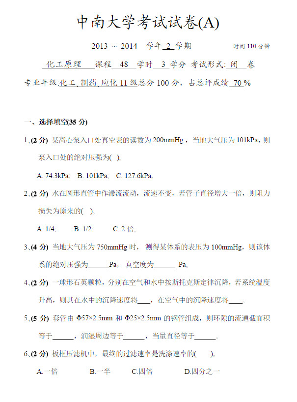 专业课考研资料 本站小编 免费考研网 2015-06-29浙江大学2014化工原理(回忆版)考研真题