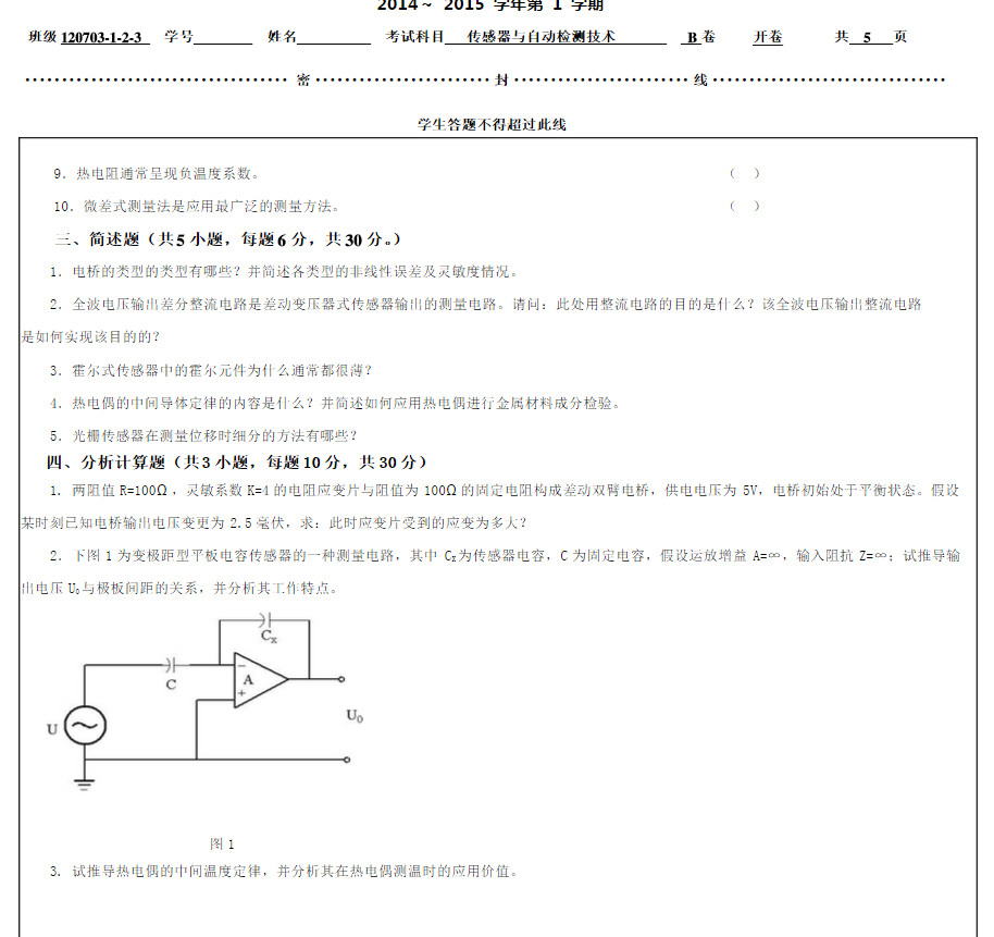 重庆理工大学2014-2015传感器与自动检测技术B第一学期考试试卷(2)
