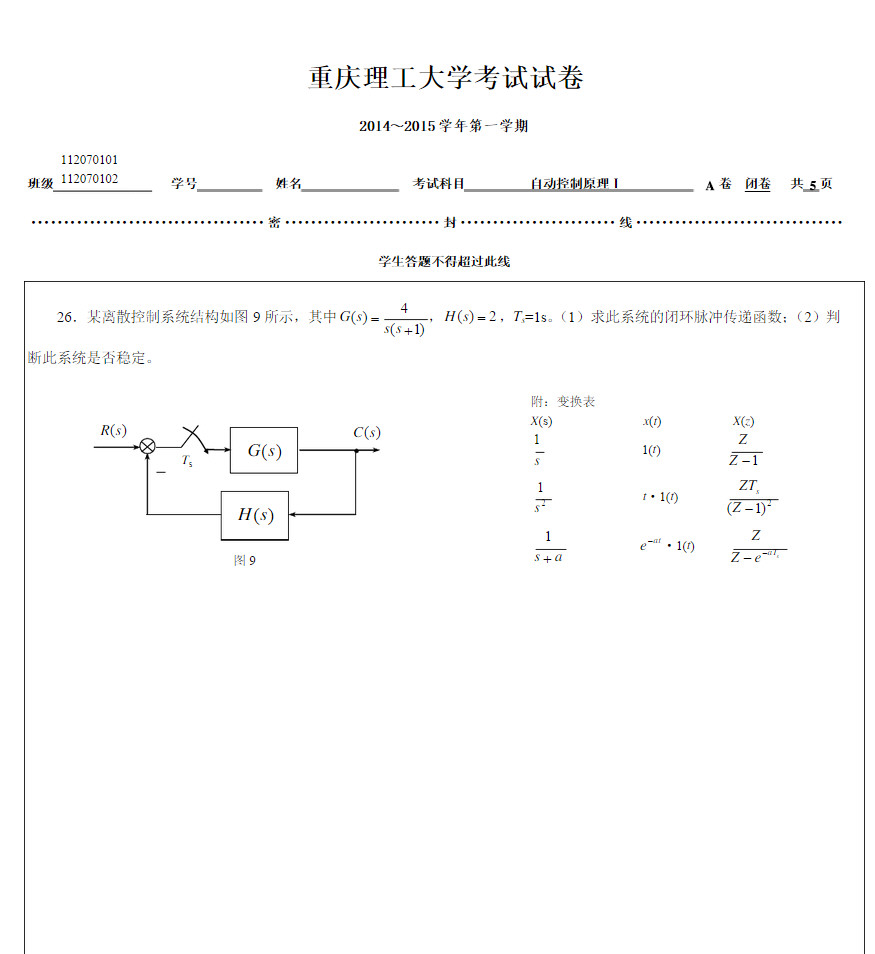 重庆理工大学2014-2015自动控制原理 I(A卷)第一学期考试试卷(5)