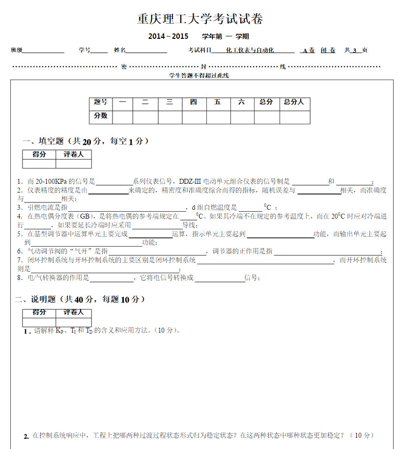 重庆理工大学2014-2015化工化仪表考试题A第一学期考试试卷