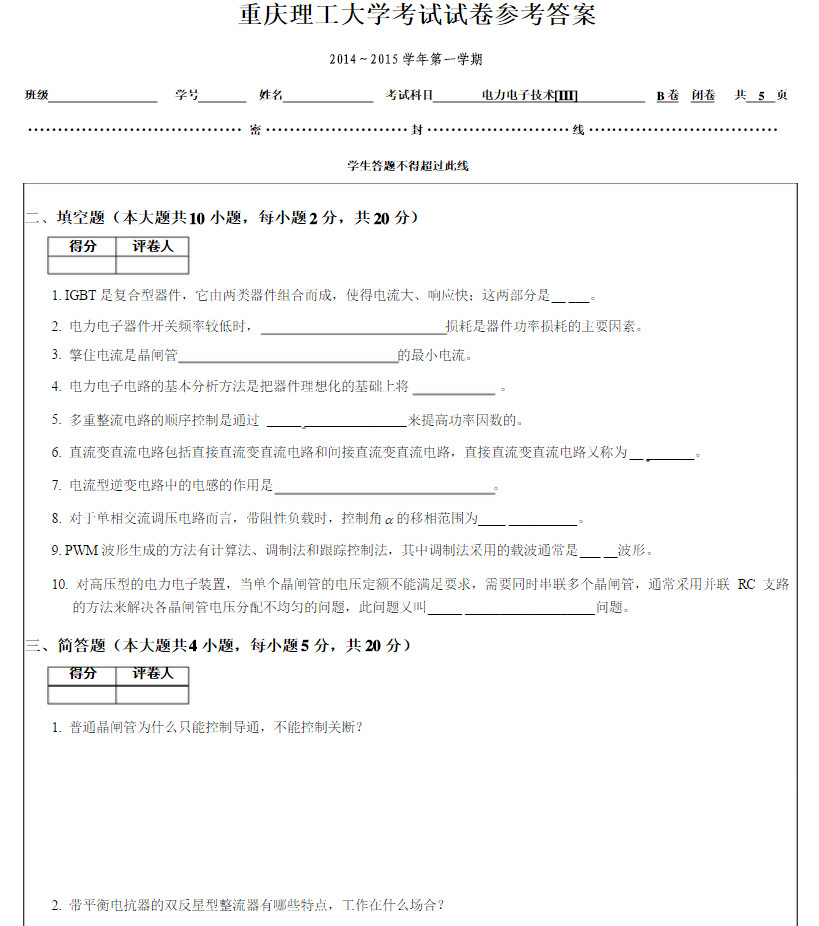 重庆理工大学2014-2015电力电子技术试卷B卷第一学期考试试卷(2)