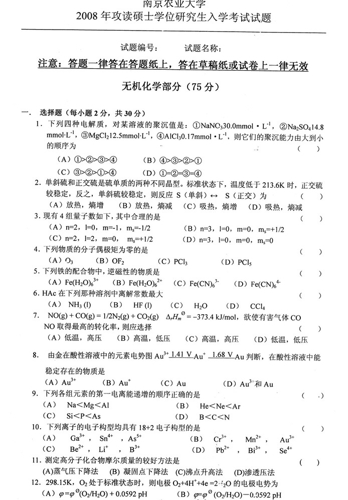 专业课考研资料 本站小编 免费考研网 2015-07-01中国科学院南京土壤研究所2012普通化学考研真题