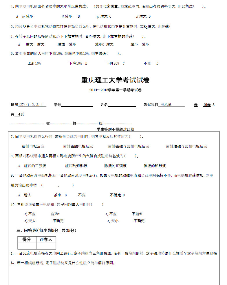 重庆理工大学2014-2015电机学试卷A第一学期考试试卷(2)