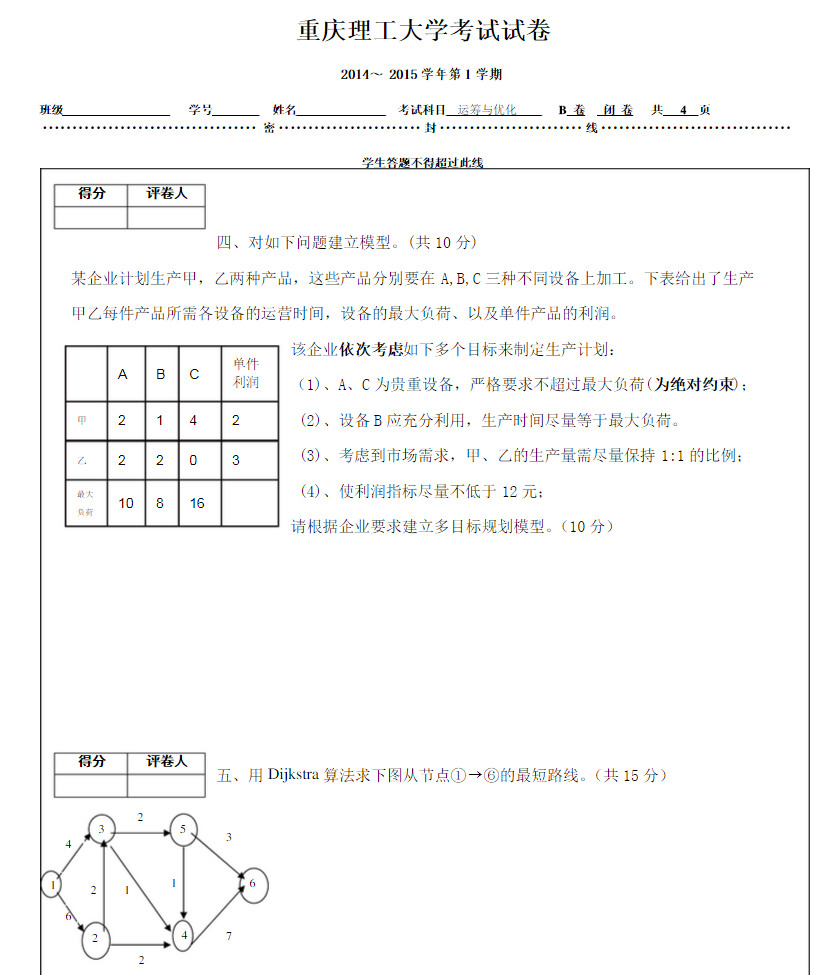 重庆理工大学2014-2015运筹与优化B卷第一学期考试试卷(4)