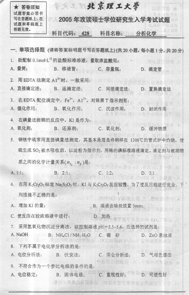 专业课考研资料 本站小编 网络资源 2015-07-08北京理工大学2008分析化学828考研真题