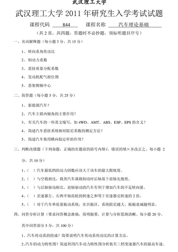 2011武汉理工大学汽车理论考研真题