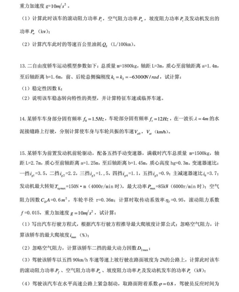 重庆大学2001-2011汽车理论考研真题:计算题(4)