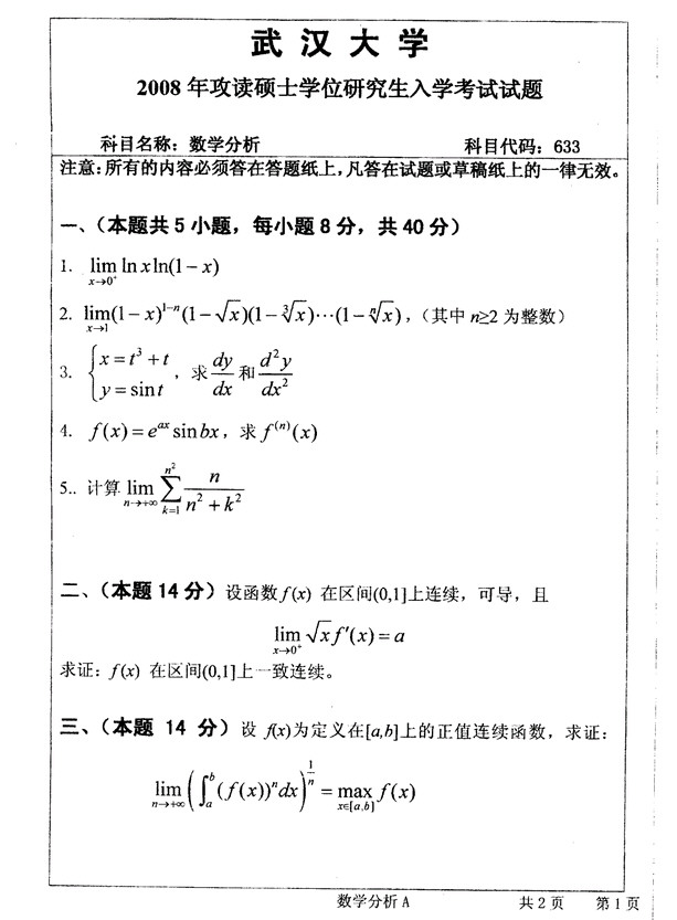 专业课考研资料 本站小编 网络资源 2015-07-14武汉大学2005数学分析试题解答