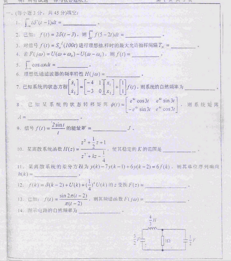 西北工业大学2003信号与系统研究生入学考试笔试题