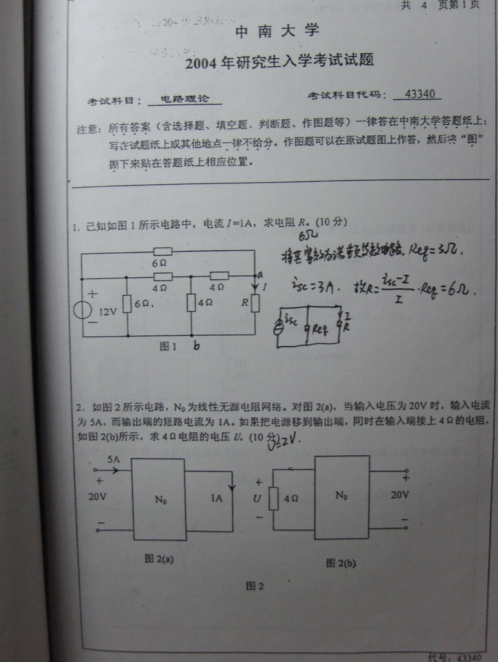 2004中南大学考研940电路真题清晰版