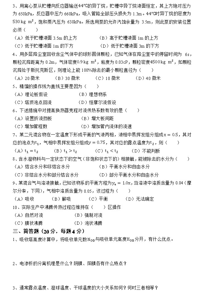 计算题考了流体力学 流体输送 过滤 换热器计算 吸收 精馏 干燥和思考题共8题(萃取蒸发在填空选择中考察) 大致说一下选择 填空题 总体不难,比以往考的简单