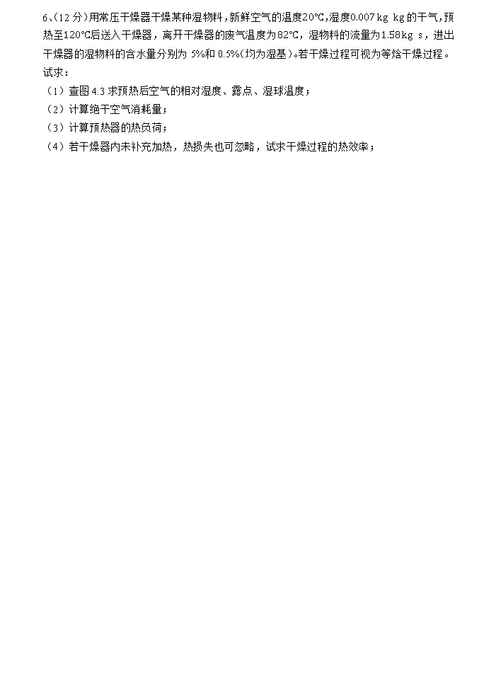 计算题考了流体力学 流体输送 过滤 换热器计算 吸收 精馏 干燥和思考题共8题(萃取蒸发在填空选择中考察) 大致说一下选择 填空题 总体不难,比以往考的简单