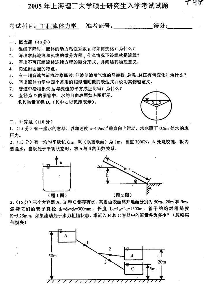 专业课考研资料 本站小编 免费考研网 2015-06-212005年四川大学流体力学试题