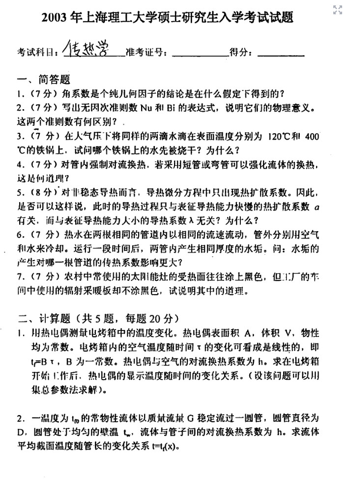 专业课考研资料 本站小编 免费考研网 2015-06-302015传热学浙大回忆版