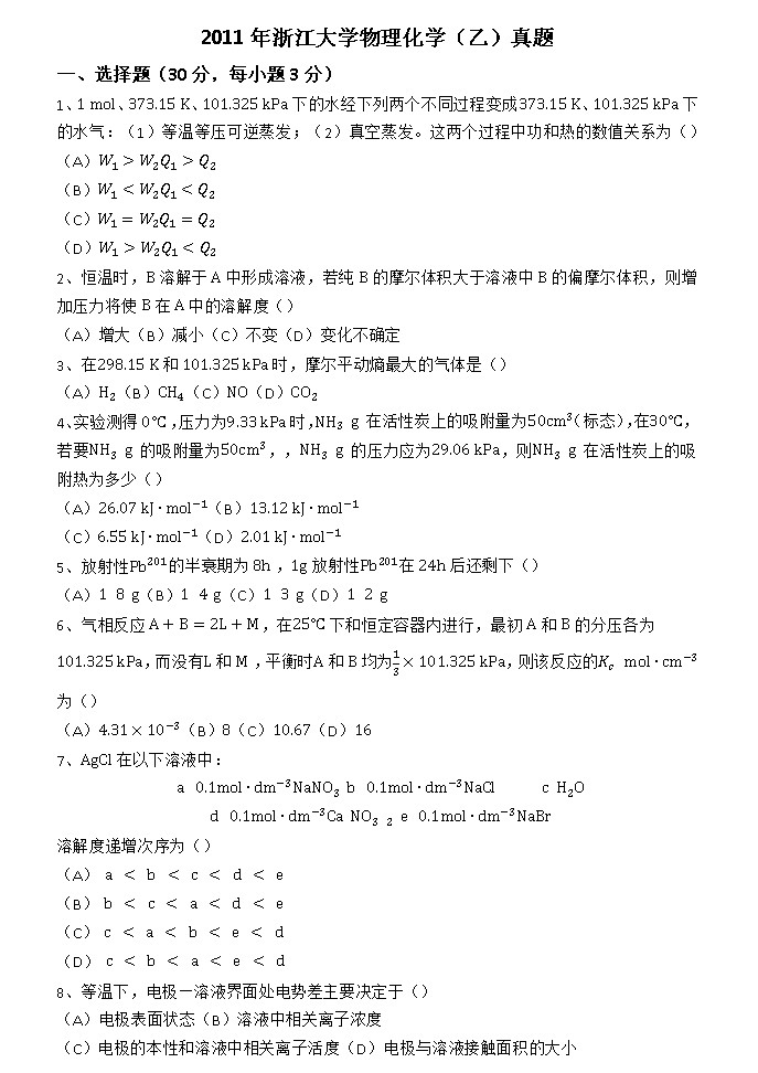 专业课考研资料 本站小编 免费考研网 2015-08-042013年西北大学826物理化学考研试题(物理化学考研试题(回忆版)回忆版)