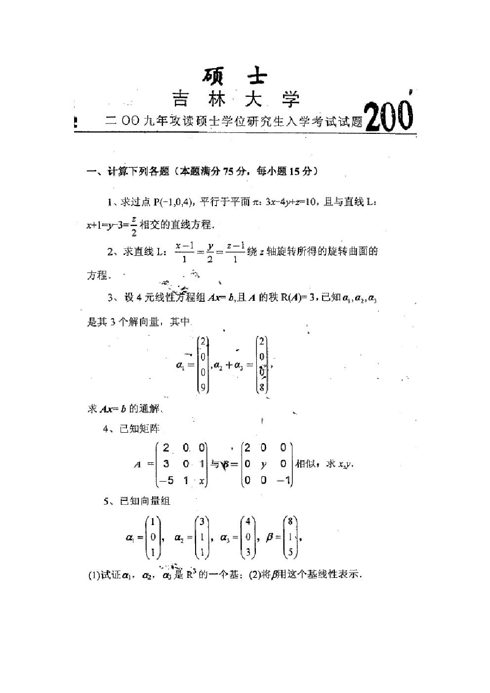 2000-2009年大连理工大学高等代数考研试题