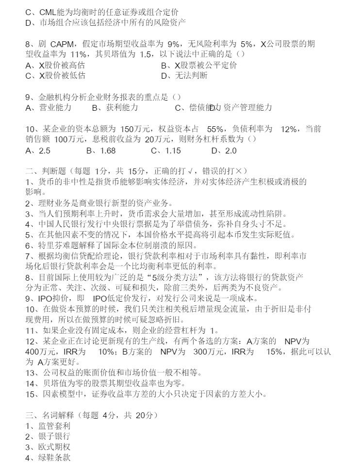 一、名词解释(4分5) 1. IMF协议第八条款 2.指令驱动交易机制 3.表外业务 4.税盾效应 5.杠杆收购 二、选择题(5分5) 1. 以下关于期权价格波动说法正确的是( ) A.对于到期日确定的期权,其他条件不变,随着时间流逝,其时间价值的减少是递增的 B.对于到期日确定的期权,其他条件不变,随着时间流 ...