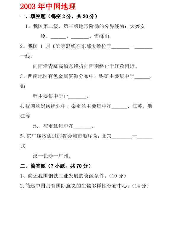 云南师范大学2000-2012中国地理考研真题(3)