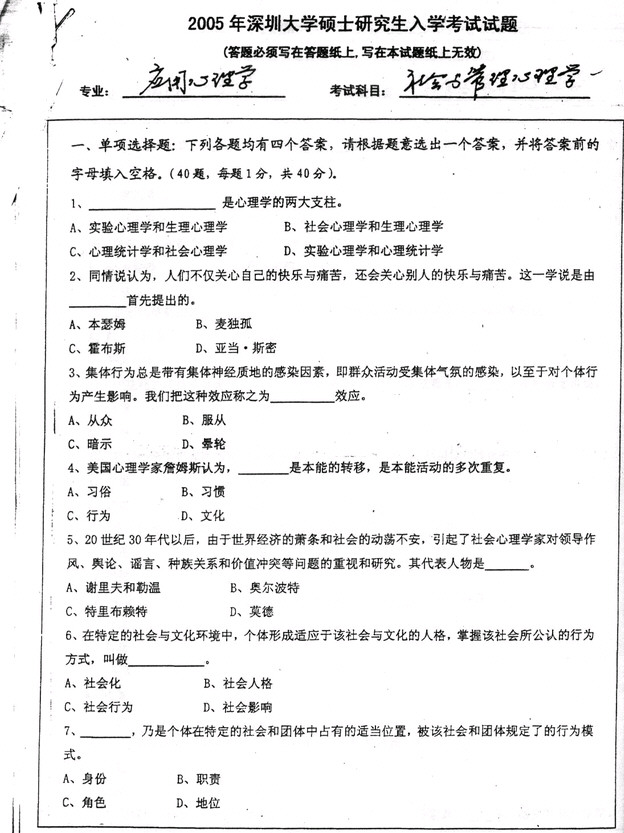深圳大学社会与管理心理学2005考研专业课真题
