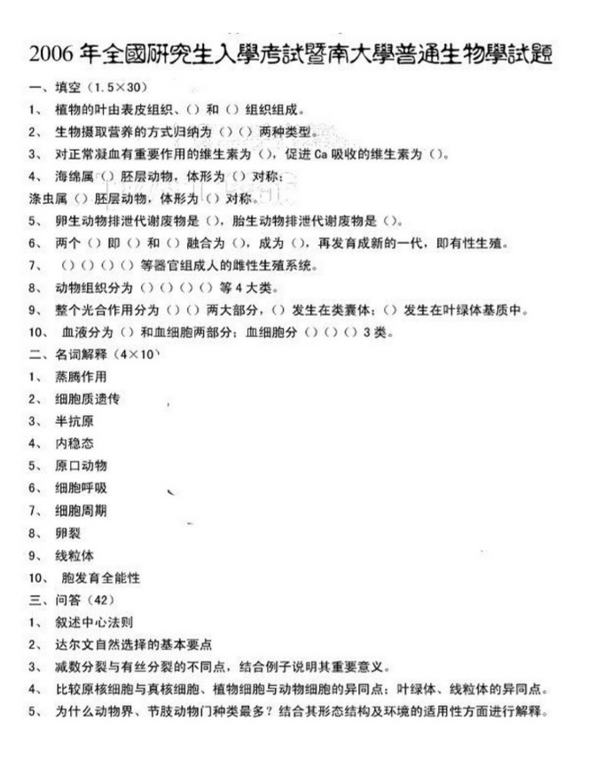 • 2015年南京大学生科院普通生物学真题(回忆版)