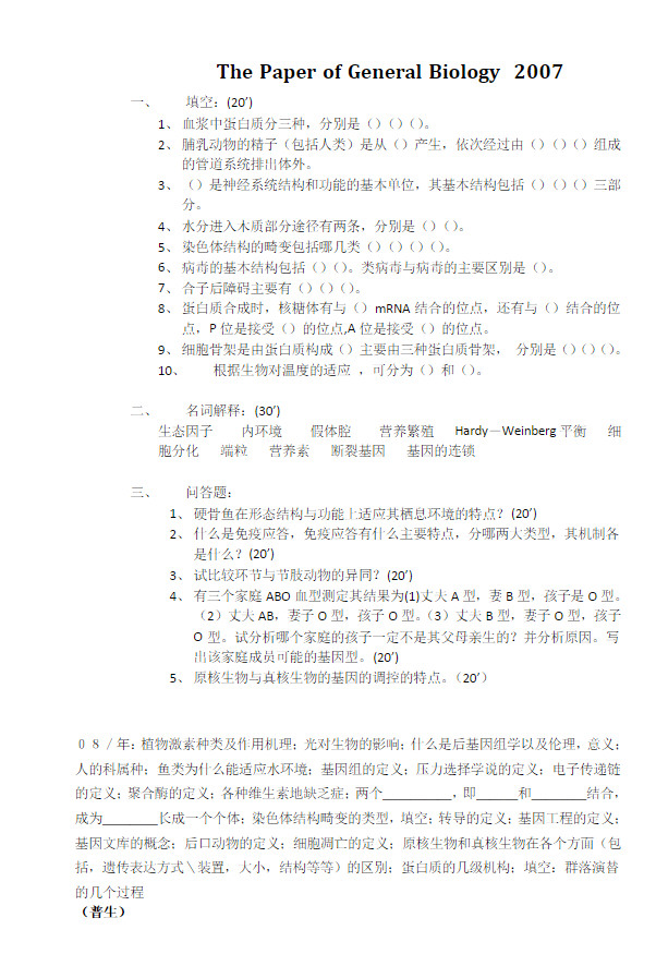2006年攻读硕士学位研究生入学考试试题__普通生物学