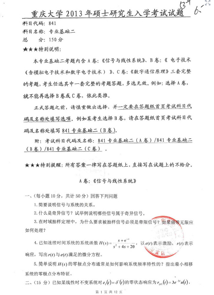 重庆大学2013专业基础二A卷信号与系统考研真题