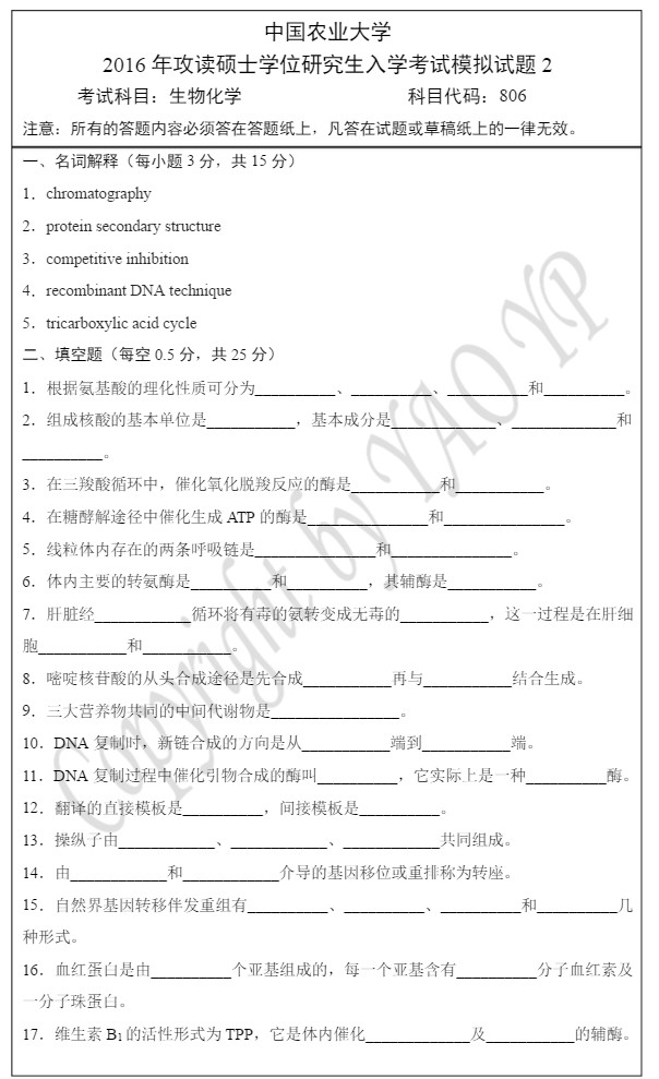 • 中国农业大学2000-2009年406生物化学考研试题合集