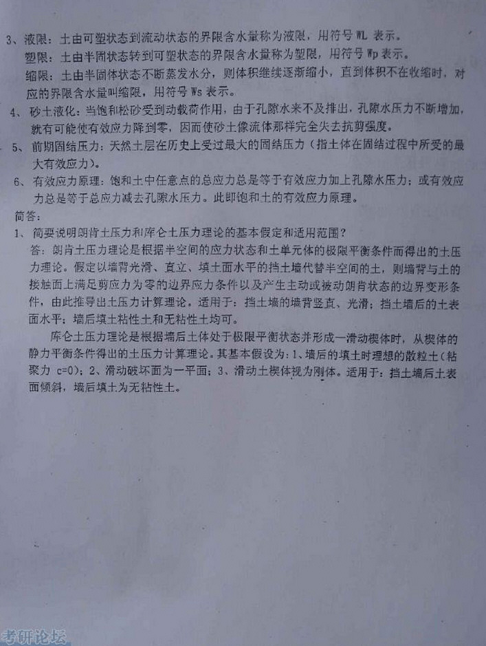 专业课考研资料 本站小编 免费考研网 2015-06-052012复试土力学 一、名词解释 1 前期固结应力 2 抗剪强度 3主动土压力 4强度破坏准则(好象是) 5基底附加应力。 二、简答题 1有效应力原理和用有效应力原理解释地面沉降。