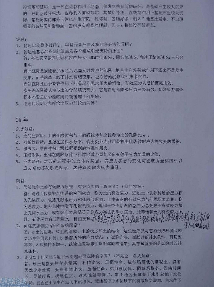 专业课考研资料 本站小编 免费考研网 2015-06-052012复试土力学 一、名词解释 1 前期固结应力 2 抗剪强度 3主动土压力 4强度破坏准则(好象是) 5基底附加应力。 二、简答题 1有效应力原理和用有效应力原理解释地面沉降。