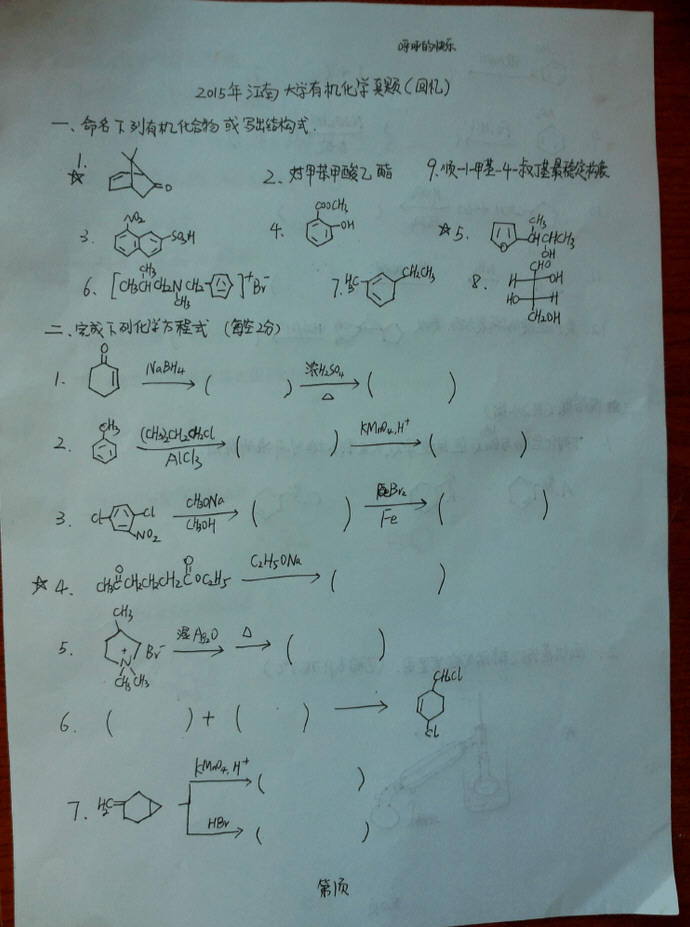 写在前面的话语: 本人2011年报考大连理工大学应用化学专业,初试专业课数学二和有机化学(885),很遗憾没有考上大工,后调剂,初试的有机化学感觉复习不好,于是在专业课有机化学考试的时候答完自己会做的题目后,将考试真题写在准考证背面,以供学弟学妹们参考。第一、二、三、四题太多了,实在记不下来,但是后面三道题 ...