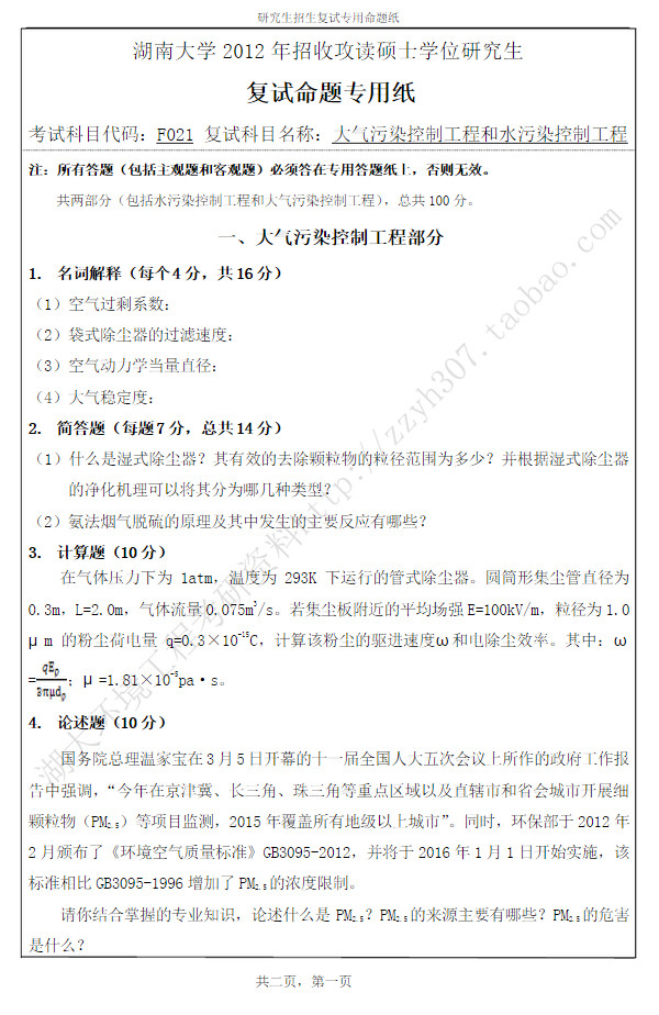 湖南大学2012大气污染控制工程和水污染控制工程复试考研真题