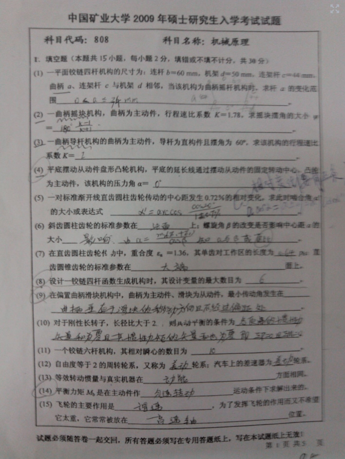 中国矿业大学2009年机械原理考研真题带答案