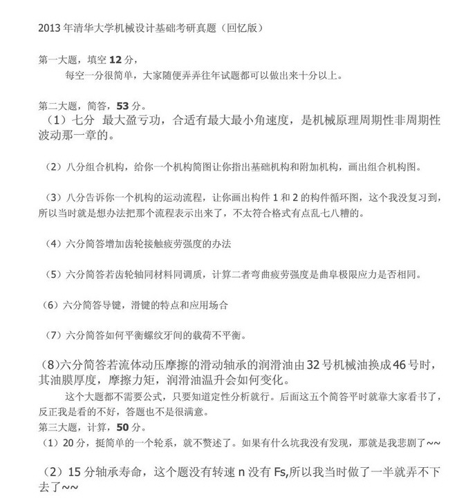 2012年同济大学机械设计考研试题年同济大学机械设计考研试题((回忆版回忆版)) 一、填空 1.关于应力疲劳的计算(记好公式3-1 带好计算器) 2.联轴器和离合器的作用 二、计算 1.关于极限应力线图的计算,一个表格10个空,求r的值5空,画应力图5空,每空1.5分 2.带传动的简答:一个是大 ...专业课考研资料 本站小编 免费考研网 2015-09-27河海大学2013年机械设计考研真题