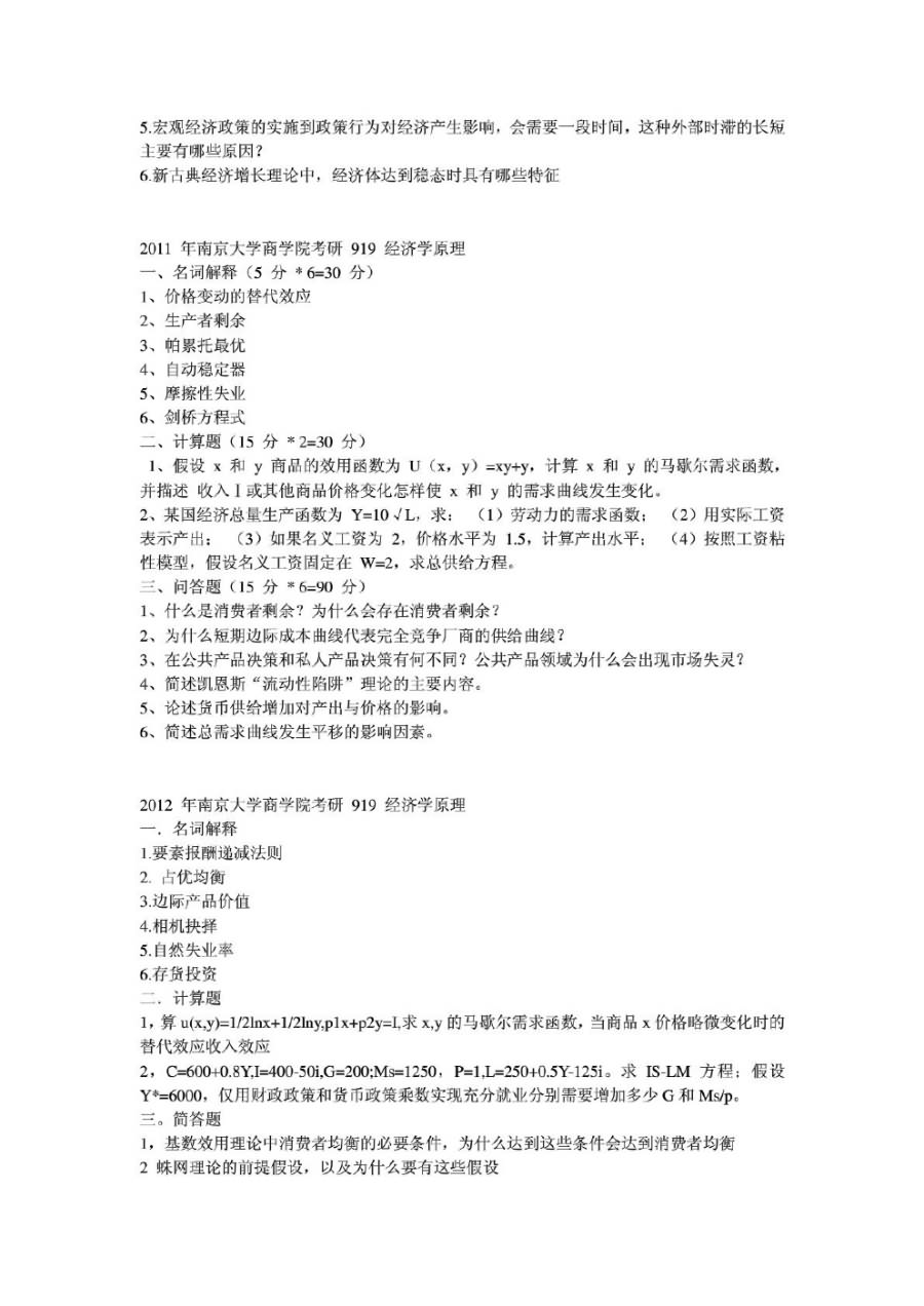 南京大学2011年硕士研究生入学考试试题 一、名词解释(共30分,每题5分) 1、价格变动的替代效应 2、生产者剩余 3、帕累托最优 4、自动稳定器 5、摩擦性失业 6、剑桥方程式 二、计算题(共30分,每题15分) 1、假设x和y的效用函数为 ...