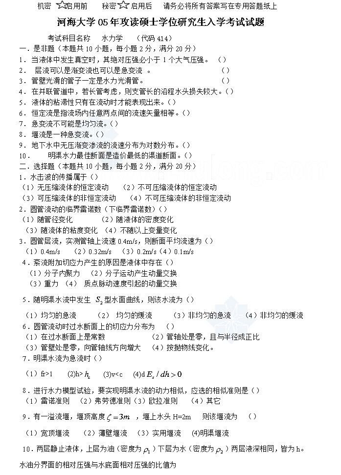 农学考研讨论 168688200 免费考研论坛 2008-07-27本人准备明年考华北水利水电学院的研究生,所以急需《水力学教程》的历年试题,所以希望哪位同人可以帮帮我,那我就先谢了。 ...