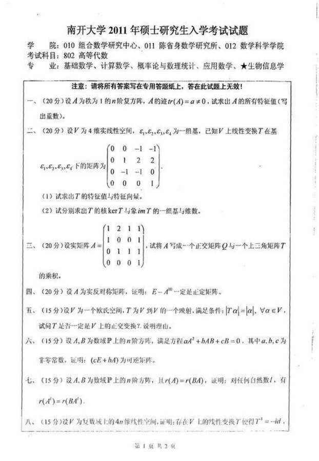 2009年华南师范大学高等代数(回忆版) 1、直接考对书中定理定义的记忆,一些特殊矩阵的性质,如可交换矩阵;(实际上,考的就是基本功吧)2、行列式的计算与多项式的根; 3、基础解系、正交补空间(课本的基本题型,考数学语言表达)4、向量组与极大无关组(课本的基本题型,考数学语言表达)5、多项式,整除问题(题目大 ...专业课考研资料 本站小编 免费考研网 2015-04-272009年华南师范大学高等代数考研真题(回忆版)
