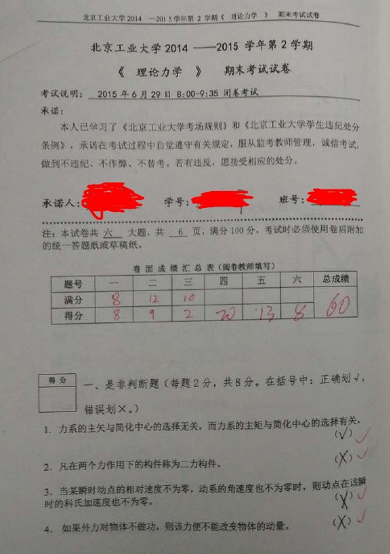 北京工业大学2014-2015第2学期理论力学期末考试试卷详细答案