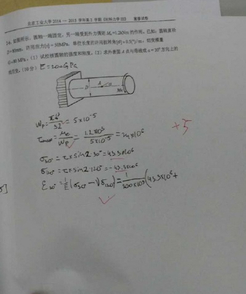 北京工业大学2014-2015第2学期材料力学期末考试试卷详细答案(4)