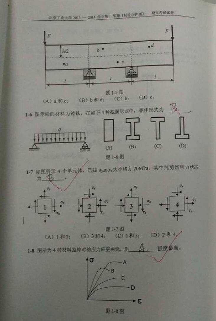 怀着激动的心情写这个2014年西北工业大学材料力学回忆版。记得去年的这个时候自己在网上查了相关真题,结果是寥寥无几,而且可靠性也有待参考。首先声明一点是,我是外校的普通本科生,考西北工业大学的难度是有的,所以当时的压力也很大,这就是我为什么会很乐意回忆2014年考研真题的原因,希望能够帮助正在压力中的奋斗在 ...专业课考研资料 本站小编 免费考研网 2015-12-04北京科技大学材料力学习题答案详解