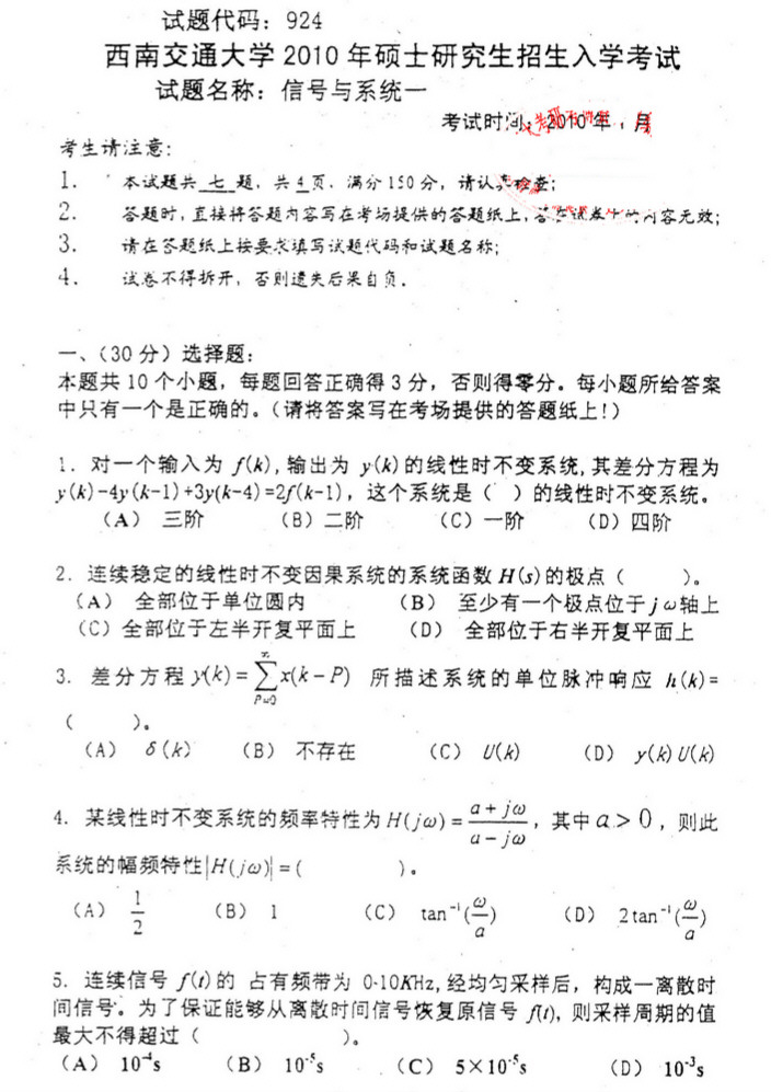 西北工业大学2005信号与系统研究生入学考试笔试题