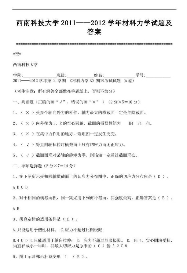专业课考研资料 本站小编 免费考研网 2015-12-07西南交通大学1986-1999年材料力学考研真题