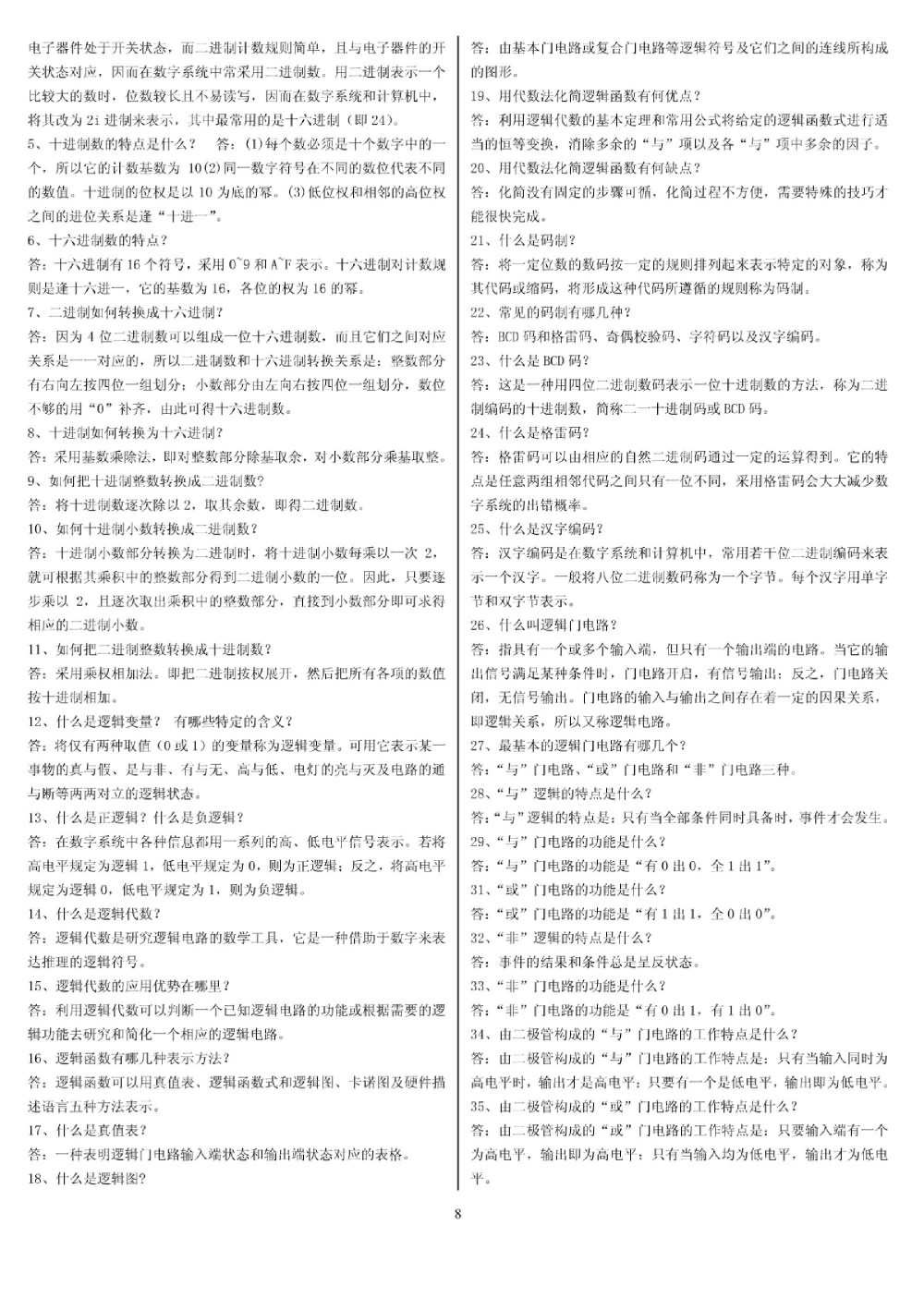 第一张正面是微机原理,填空题10分,10个空。问答题1道,3小问,10分。微机原理共20分。 填空题的内容: 写出补码 提供CS、DS、SP、IP等数值,要求写出第一条指令的物理地址,以及程序数据的物理地址范围 其他不记得 问答题是考的8255,第一问要求写出8255的四个接口地址,第二问要求写出控制字,第三问是编写一段汇编程序实现所要求的功能 第一张反面是数字电路,填空题10分,10个空,计算题4道,每题3分,数电一共22分。 填空题都比较基础,其中两道题是选择题,给你四个不同名字的电路,问你哪个是时序逻辑电路,哪个是非时序逻辑电路 4道计算题有3道都是逻辑化简吧,会卡诺图就行了,另外一道是一个三态门逻辑电路,写出最简逻辑表 ...