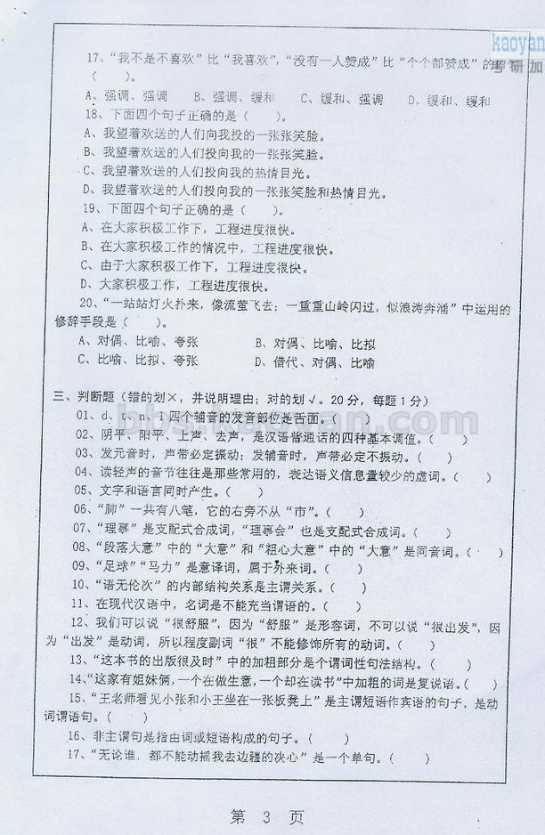 2013年南开文学院848现汉和概论 概论部分: 一:名词解释 直接组成成分 语法范畴 语系 亲属语言(记不清了,但是挺简单的。名词解释一般而言把书上划线的名词解释记住就行了) 二:判断并说明 三:举例说明 四:国际音标 现汉部分: 一:分析 造字法、词性、同义词辨析、分析两组词组在语法意义和语法结构上的差异 ...