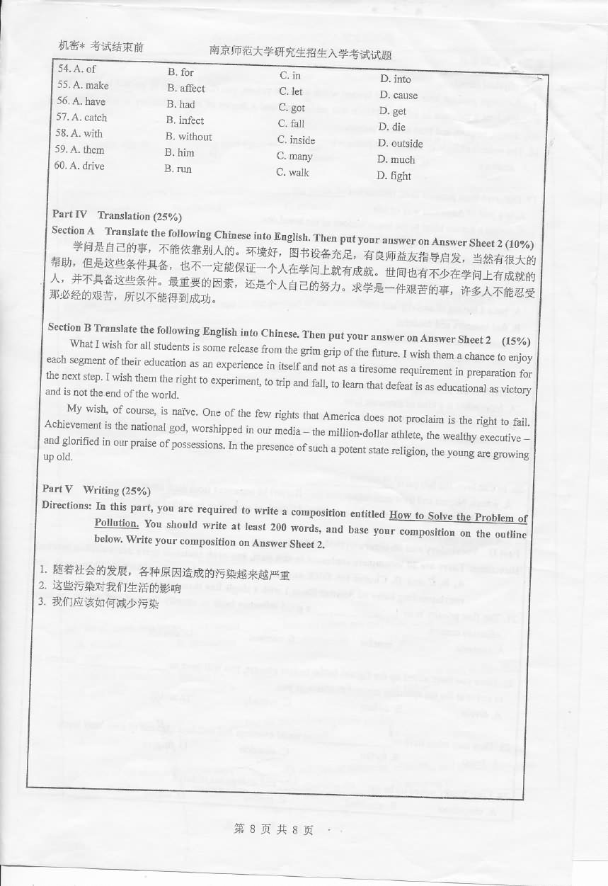 南京师范大学2015年博士英语1001考博真题(8)